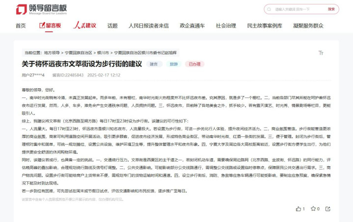 人民网银川3月1日电(记者穆国虎)近日,有网友在人民网“领导留言板”上留言,建议将“怀远夜市文萃街设为步行街”,提出优化怀远夜市及南华时光街发展的方案。收到留言后,银川市西夏区人民政府办公室作出详细回应,表示优化方案中的部分措施已进入实施阶段。