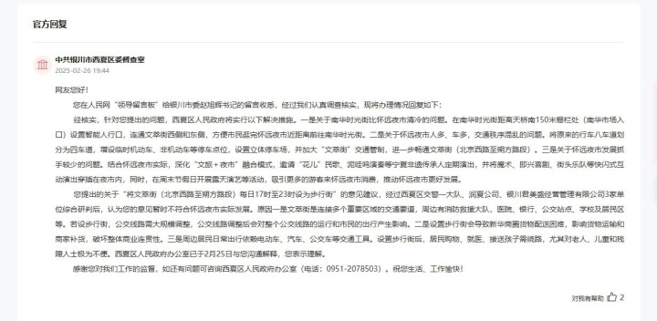 有回音丨网友为银川夜市发展支招 回复: 积极采纳